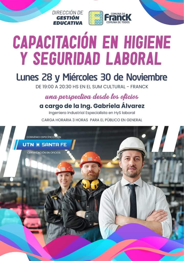 En el marco del convenio de cooperación entre la Universidad Tecnológica de Santa Fe y la Comuna de Franck, la Dirección de Gestión Educativa, llevará adelante una capacitación en higiene y seguridad laboral a cargo de la Ing. Gabriela Álvarez y estará dirigida a los alumnos de los diferentes cursos de oficios que brinda la Escuela de Arte y Oficios y al público en general.