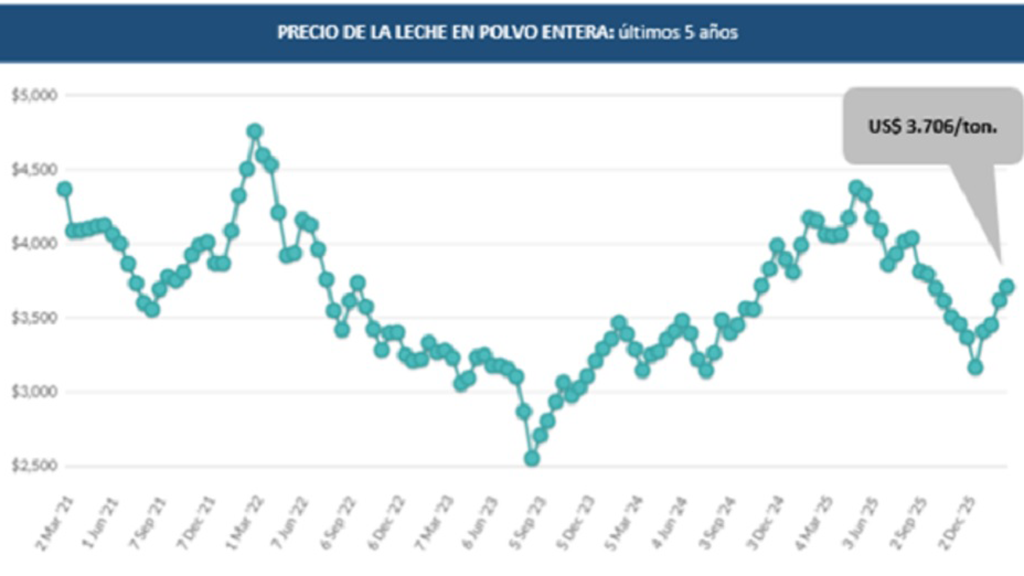 Tras un cierre de 2025 para el olvido en materia de precios, el 2026 arrancó con valores positivos para la leche en polvo. La segunda subasta de febrero del GDT reafirma esta tendencia por segundo mes consecutivo, subiendo 2.5%.