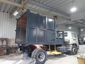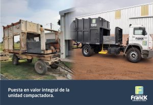 – Recambio del piso del compactador y algunas teleras de upn 100mm en mal estado. Aplicación de antióxido y arenado completo con fondo epoxi y acabado con gris Scania. Guías de pistón nuevas, colocación de burletes de goma en portón trasero. Instalación eléctrica del compactador -luces reglamentarias y de trabajo (Led)-. Rotulados nuevos.