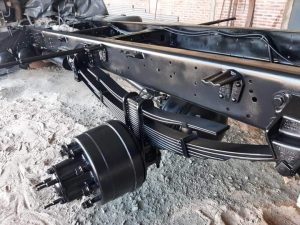 – Desarmado y arenado de ruedas, chasis, eje y masas de rueda. Fondo epoxi completo a todo lo arenado, acabado negro satinado mate original; y fondo epoxi gris poliuretano a las llantas.